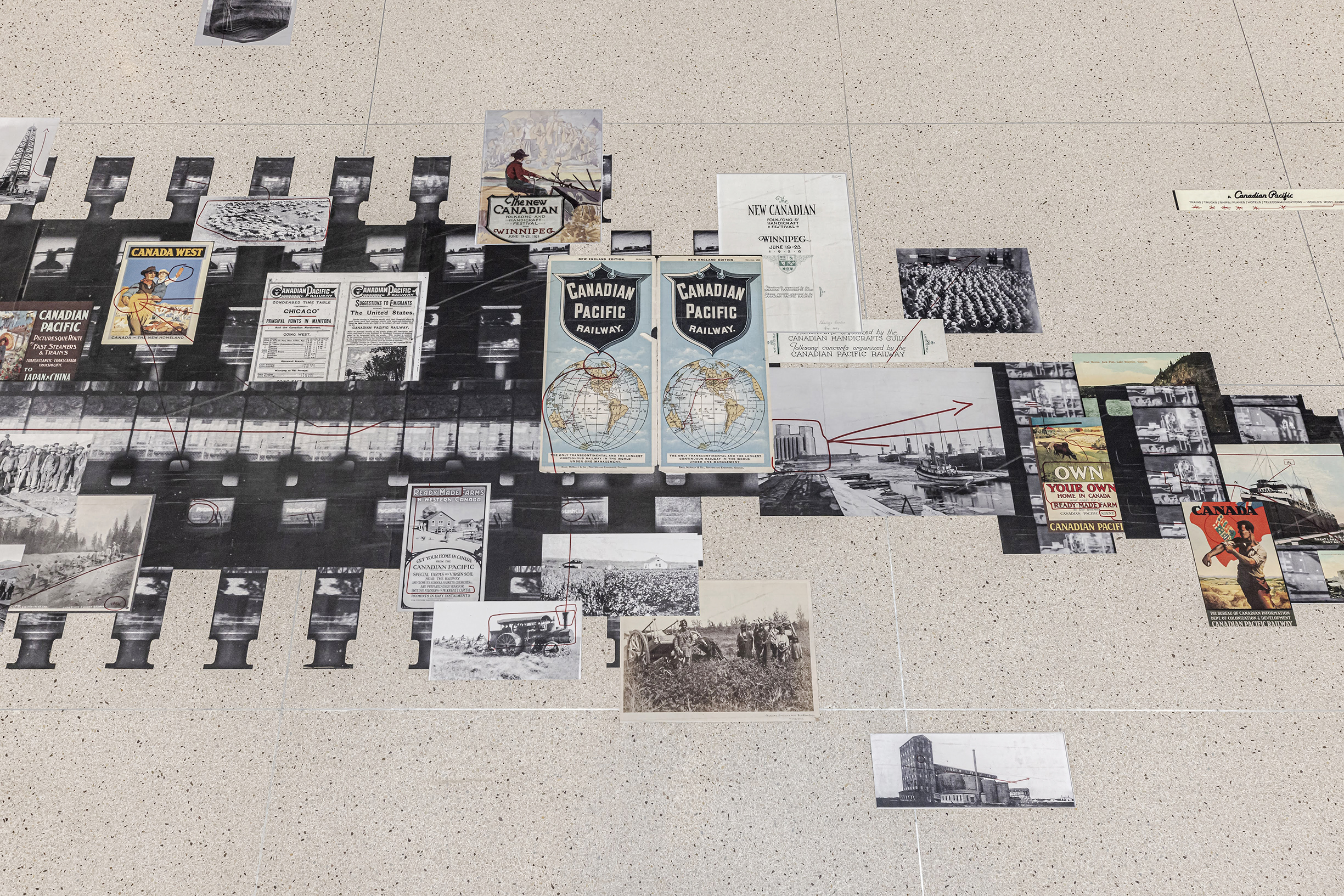 "This digital collage is made from archival material and photographs taken by the artist staged to look like investigative images. The documents are shaped onto a map of the Canadian Pacific Railway (CPR) from the St. Lawrence River to the West Coast. The work traces the history of the CPR, and its role in the colonization of Canada. It reviews the CPR’s white settler propaganda, its role in mining projects throughout the country, its involvement in tourism and the arts, the history of railway blockades, the abuses that Chinese workers endured while building the railway, and much more. Turning the floor of Union Station into a scattering of historical material, the project uses the visual logic of conspiracy theories to obscure the real history of the CPR, which is hidden in plain sight—a story of capital, extraction, and land dispossession.