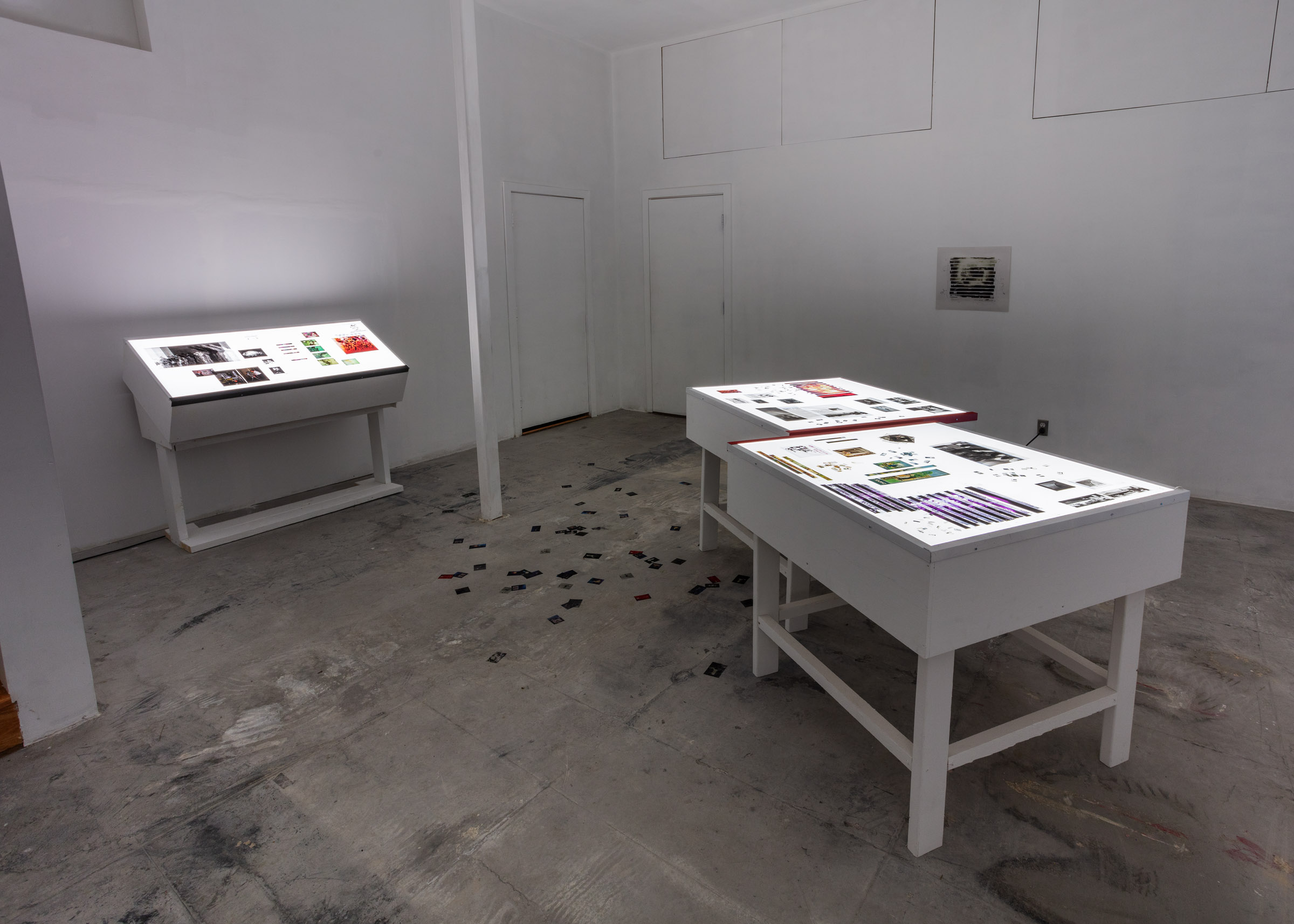 The photographs and documents displayed on the tables revolve around a peculiar historical episode, spanning between the 1910s and the 1960s, during which time military-industrial giant DuPont chemical was enthusiastically researching and manufacturing new and experimental kinds of cinematic film stock. The fragments of text and imagery act as forensic documents, attesting to these unlikely threads between military-industrial power and artistic production, connecting them with little-known patronage networks DuPont maintained with many influential painters, musicians, and performers throughout the era.
