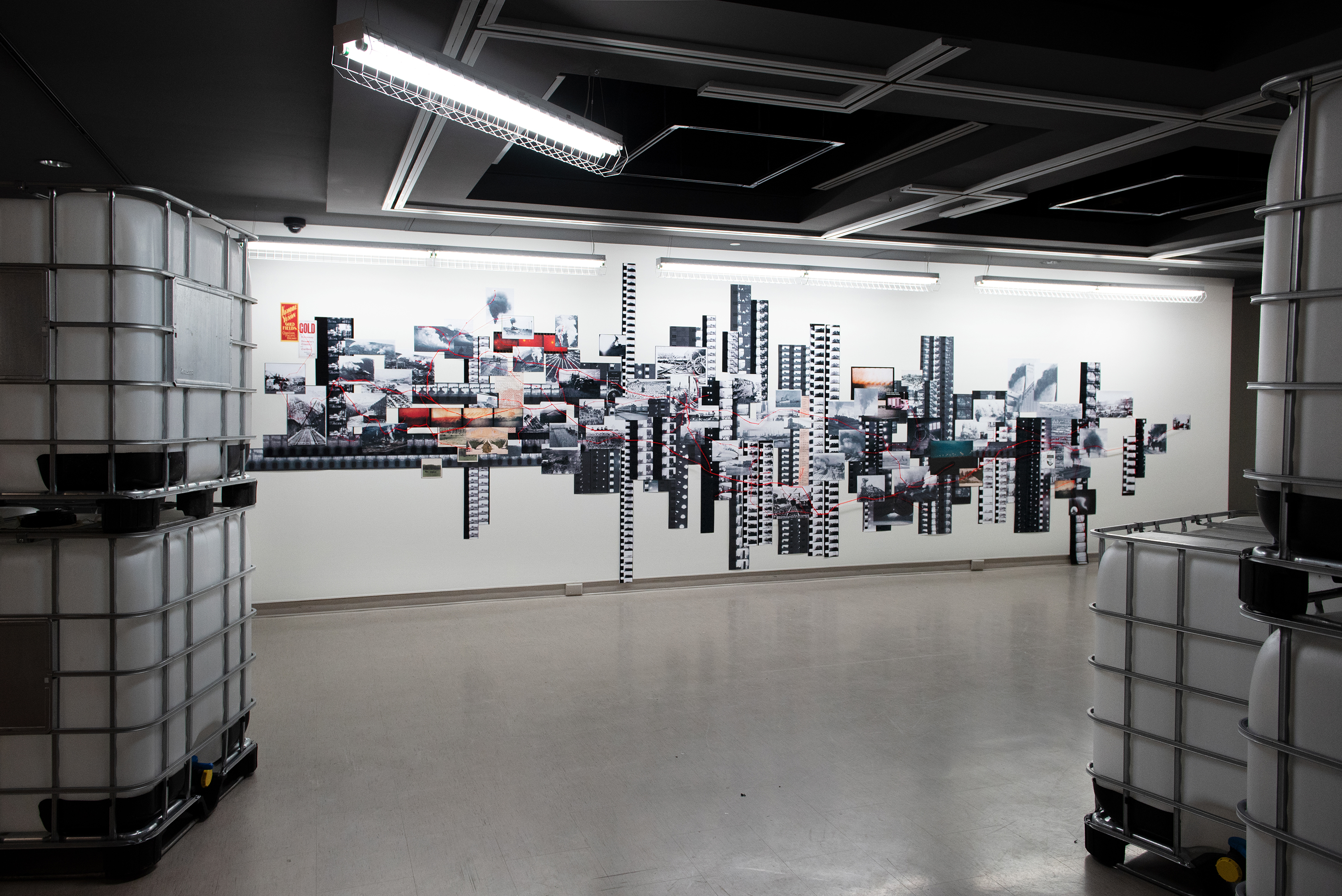 inkjet prints on matte presentation bond, brad nails, Plasti-Dip rubber spray paint, synthetic yarn, fluorescent lights, aluminum cages