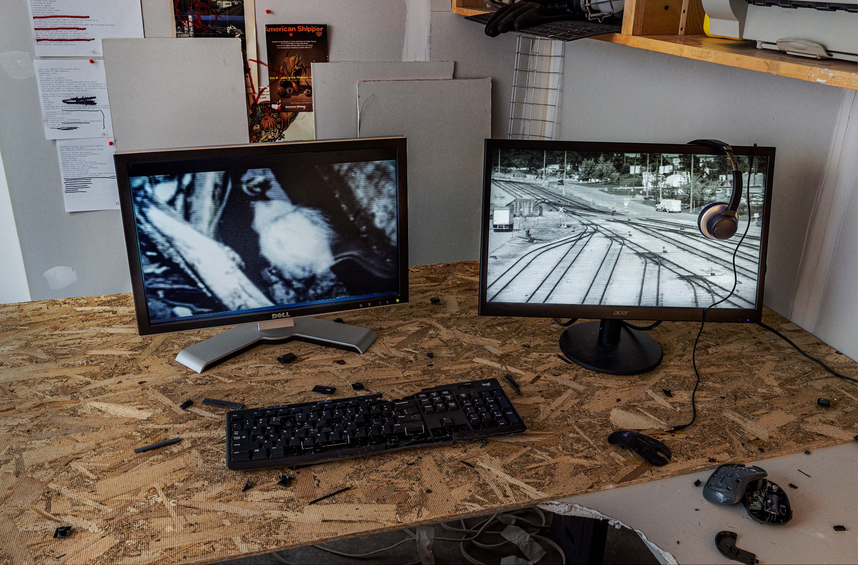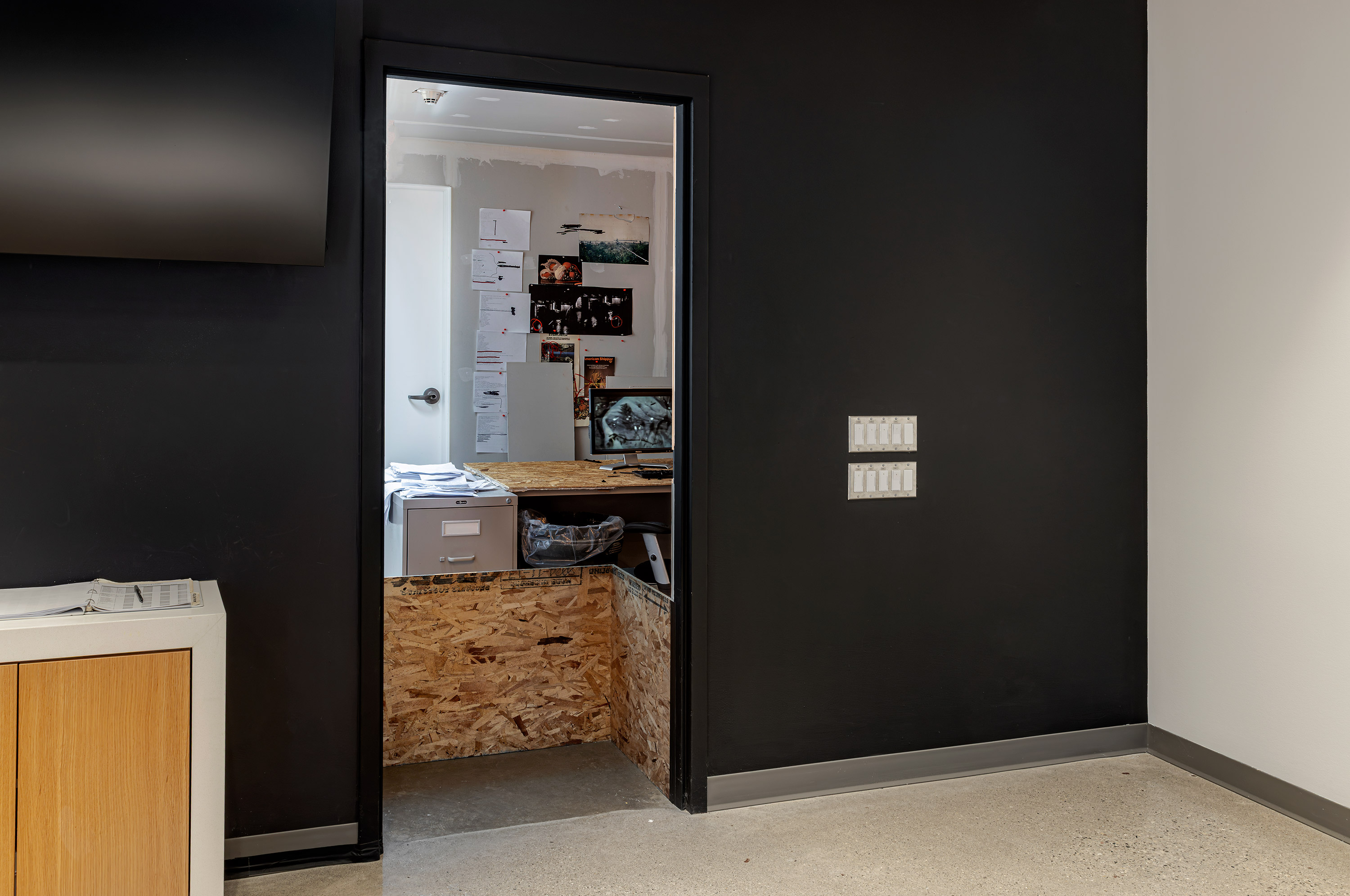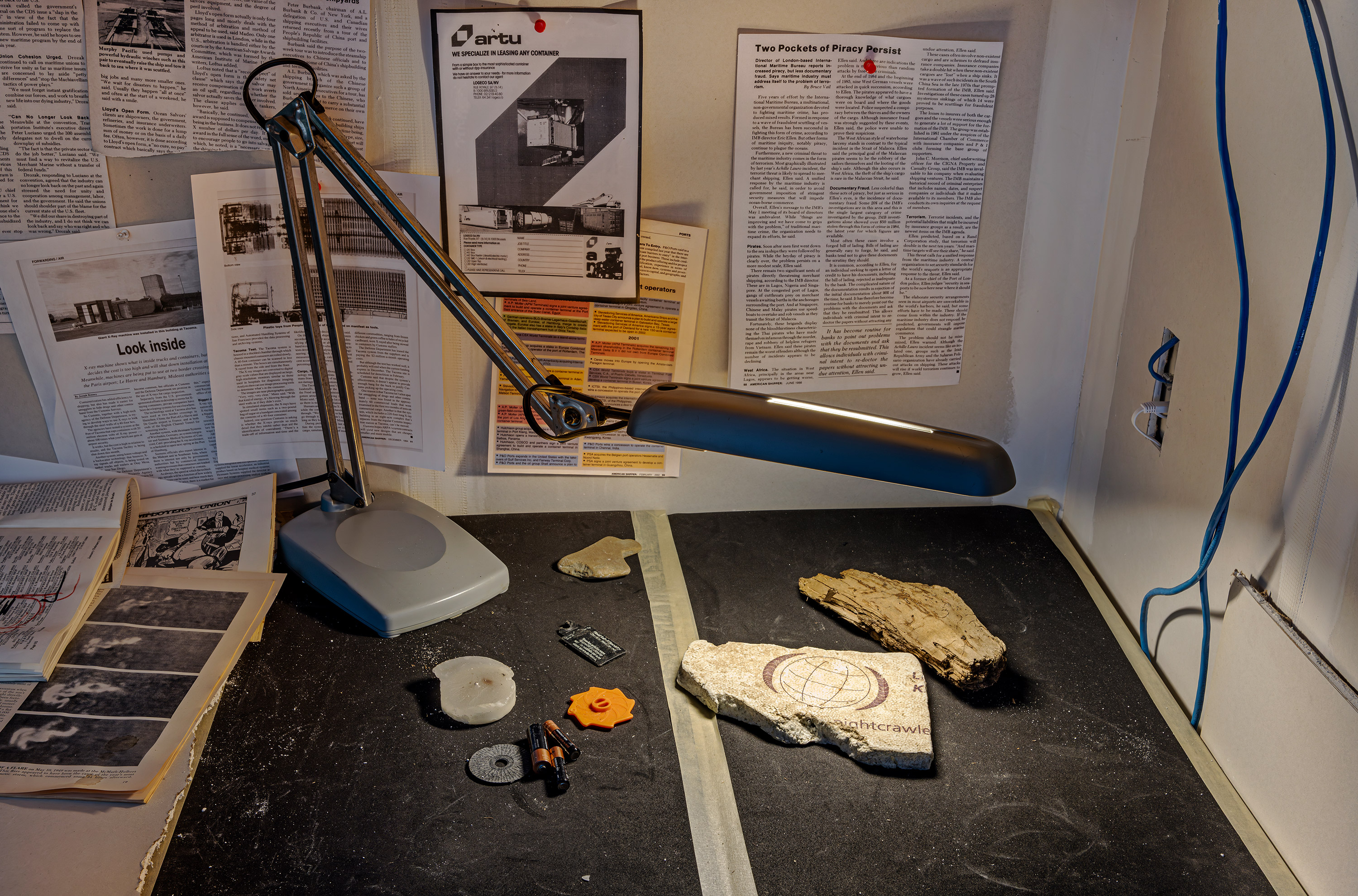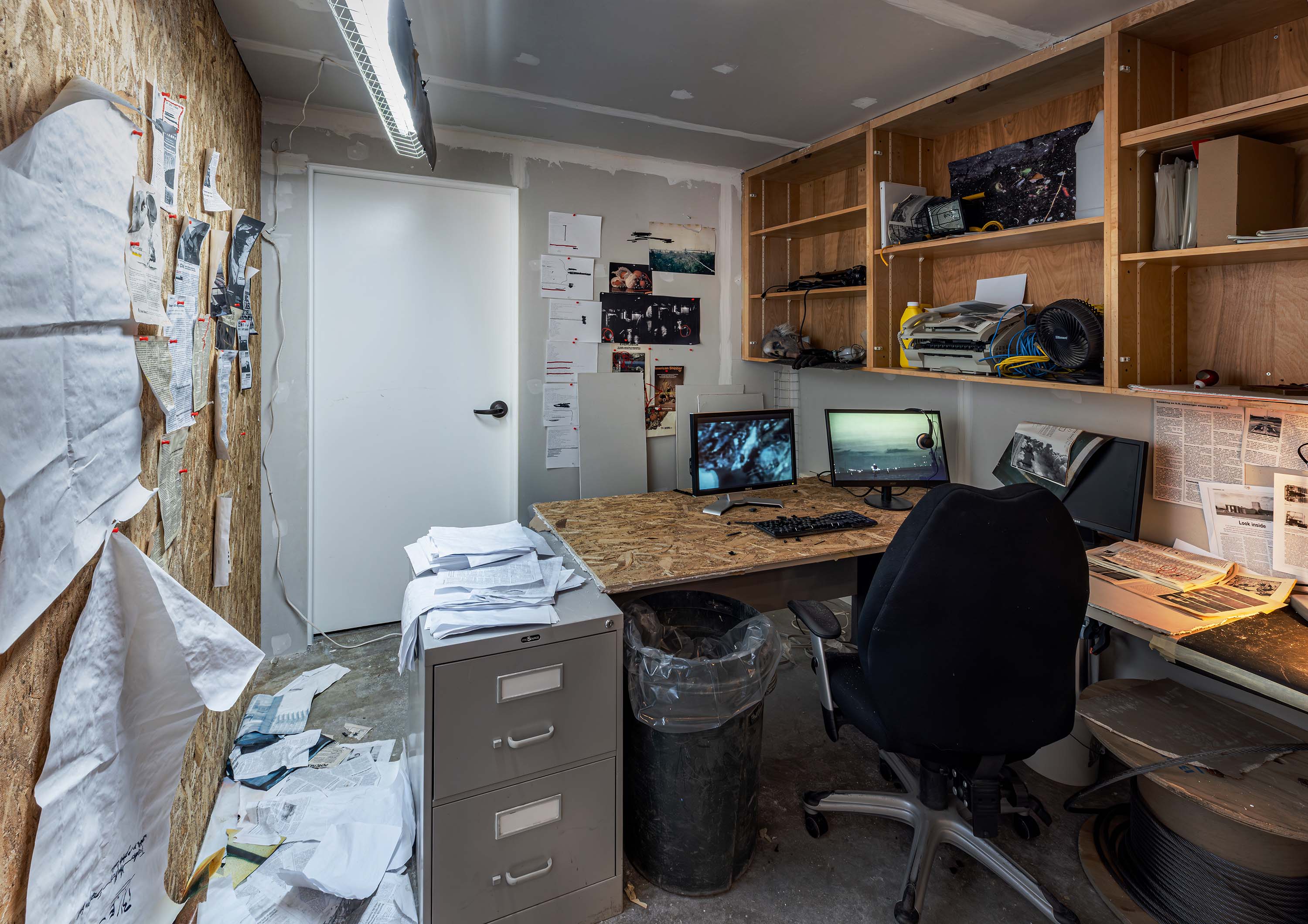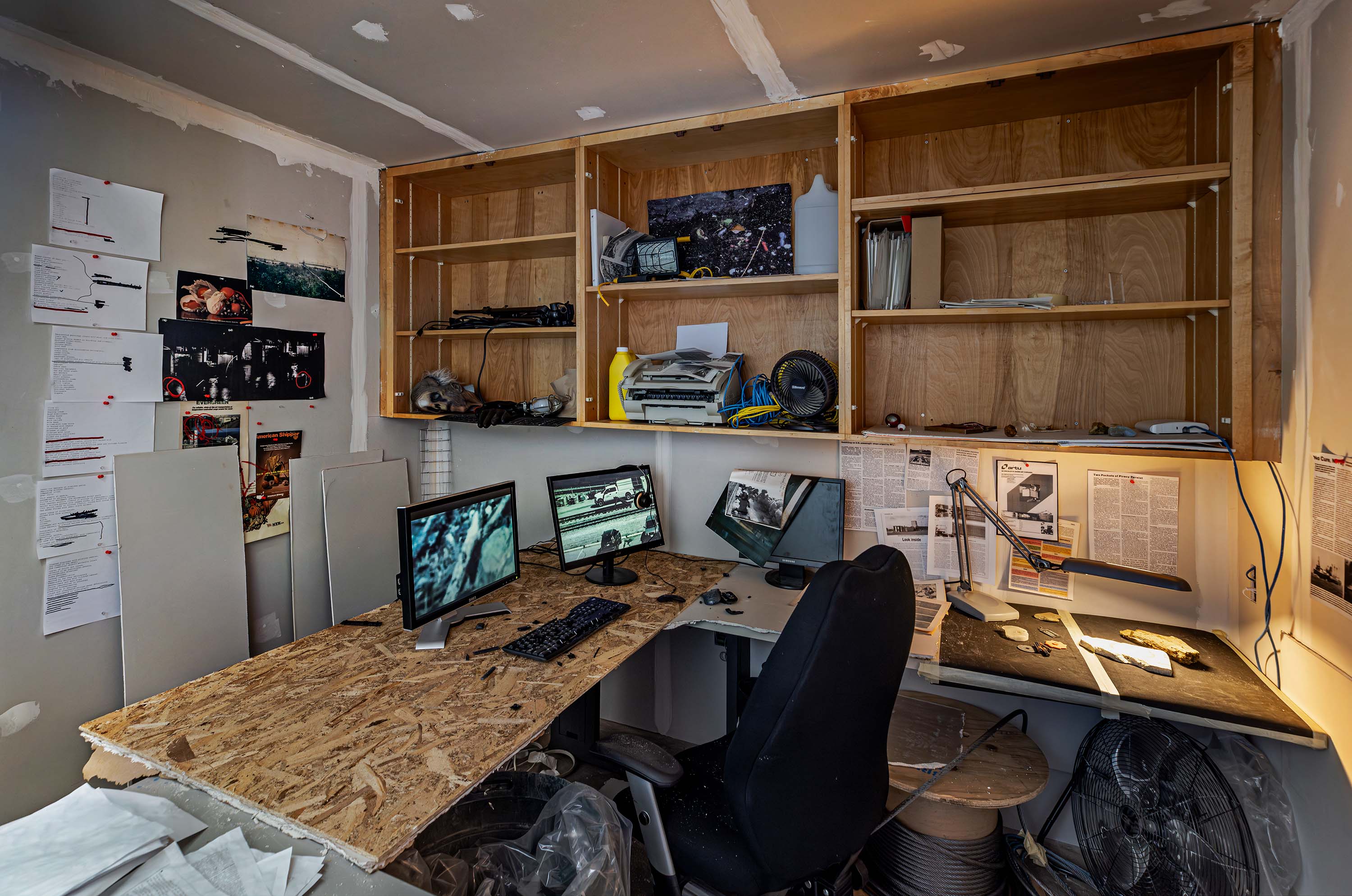 The installation pulls on a thread of speculative fiction from the exhibition's central video, imagining the fugitive working environment of the film's conspiracist narrator as if found abandoned and preserved by the institution.